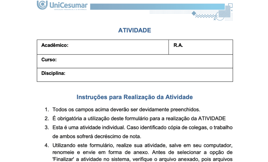 1. Será necessário utilizar o modelo (formulário-padrão da Atividade) disponibilizado na pasta “Material da Disciplina”. No formulário constam os campos específicos para inserção de tema, nomes de alunos, problema, objetivo geral, justificativa e metodologia.